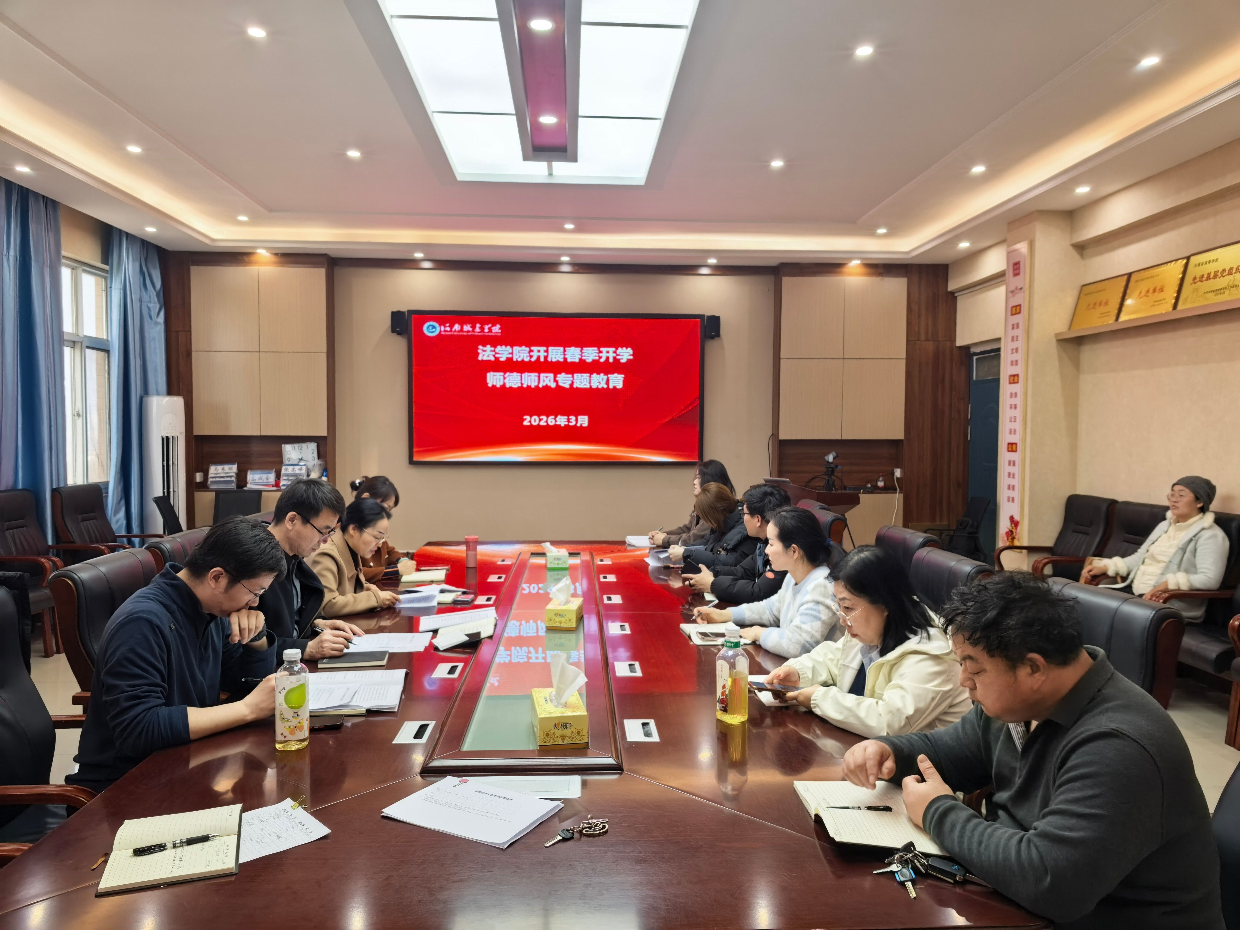 会上,全体教职工重温了《中华人民共和国教师法》中关于教师义务的相关规定,进一步明确新时代高校教师的职业操守和行为边界。同时,结合法学专业特色,重点学习了学术诚信与科研伦理相关要求,引导教师在法学研究中坚守师德、弘扬正气,杜绝学术不端行为。