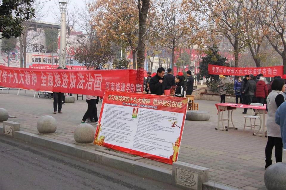 (通讯员:魏丽君 汪浩波)为深入贯彻党的十九大及习近平总书记系列重要讲话精神,认真落实全面推进依法治国方略,增强全民法治观念,推动全社会树立宪法意识,12月4日,法学院在市区鹰城广场、学校土木学院教学楼前及学校行政楼前,开展了一系列法制教育活动。法学院院长王艳芳、团总支书记张强等多名老师和百余名学生参加了此次活动。