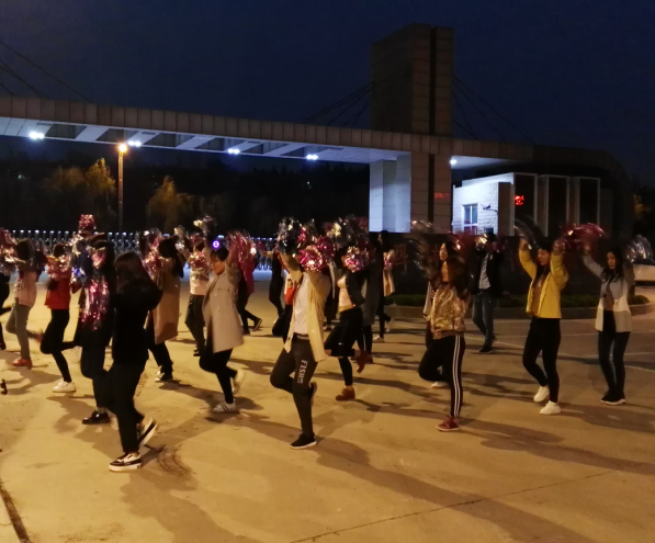 天色渐暗,银色的小星星已经亮闪闪地点缀在天空。同学们相伴而来,亲密有趣的交谈让同学们时不时发出大笑。伴随着欢乐,来到训练场地。音乐声响起,同学们整齐划一的动作,有力的口号,让过往的行人不由得停下脚步,来欣赏这一场视觉享受。舞毕,热烈的掌声响起来,全体成员也露出了欣慰的笑容。一份付出一份收获,风雨无阻的练习终会获得大家的肯定。