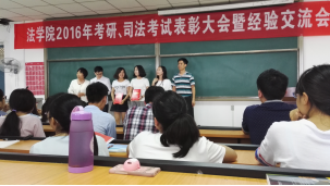 (通讯员:邓蕾 李会亚)又是一年毕业季。又将有一批优秀的人才离开河南城建这个校园,有的奔向社会工作岗位,有的考研成功继续深造。为了给学弟学妹展现法学专业的前景,2016年6月3日,法学与公共管理学院在1号教学楼428教室开展考研、司法考试表彰大会暨经验交流大会,全体法学专业学生参加。