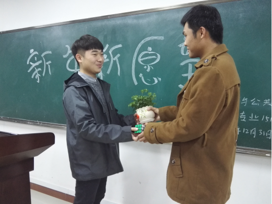 在活动的筹备阶段,同学们利用课余时间积极准备,为活动的正常开展奠定了良好的基础。当天晚自习,元旦庆祝活动正式开始。活动以班级派对的形式展开,主持人为大家准备了趣味性极强的小游戏,同学们热情参与,现场欢声笑语不断,气氛和乐融融。更有辅导员赵老师现场助阵,不仅参与游戏还进行点评指导。游戏过后是同学们精心准备的魔术表演,表演者以高超的技艺从一块方布中变出一个个小礼物,现场送给大家,给同学们带来了极大的惊喜。之后进入到同学互换新年礼物环节,礼物虽小,但都是同学们的一份心意,一份真挚的祝福。最后全体同学一起在彩纸上写下了自己的新年愿望并将之贴在黑板上,对自己许下了无限美好的祝愿。古人云:每逢佳节倍思亲,临近学期结束,离家半载的同学们难免会思亲,但是这次活动给大家带来了家的味道和爱的温暖,法学与公共管理学院就是一个有爱的大家庭!