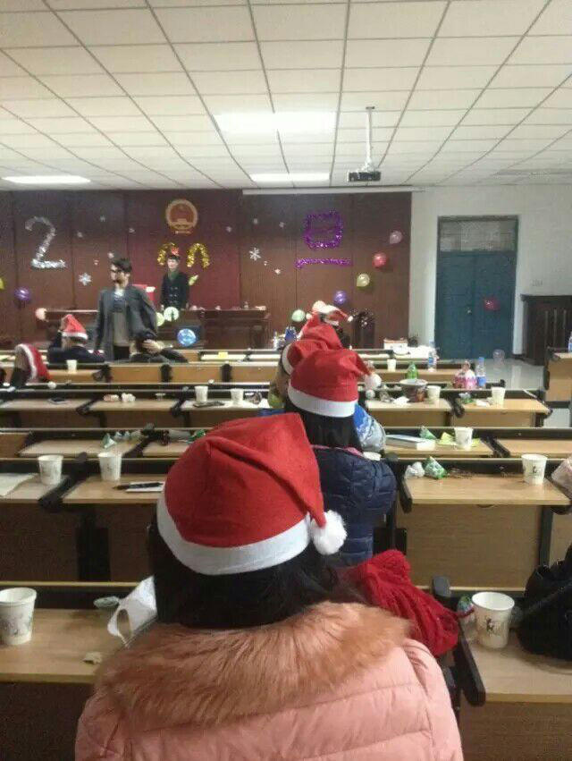 (通讯员:邓蕾 李会亚)为丰富我系学生会成员的校园文化生活,增进学生会成员之间的友谊,促进其交流,同时可以让大家度过一个难忘的双旦,12月24日圣诞夜,法学与公共管理学院在模拟法庭举办了喜迎双旦晚会,全体学生会成员参加。