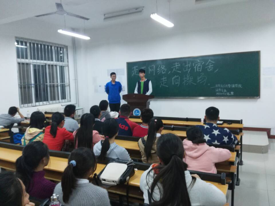 (通讯员:邓蕾 张之青云)为了深刻贯彻落实党的十八届三中全会关于“强化体育课和课外锻炼,促进青少年身心健康和体魄强健”的精神,10月30日晚,法学与公共管理学院开展了以“走下网络,走出宿舍,走向操场”为主题的活动。全班同学参加了此次活动。