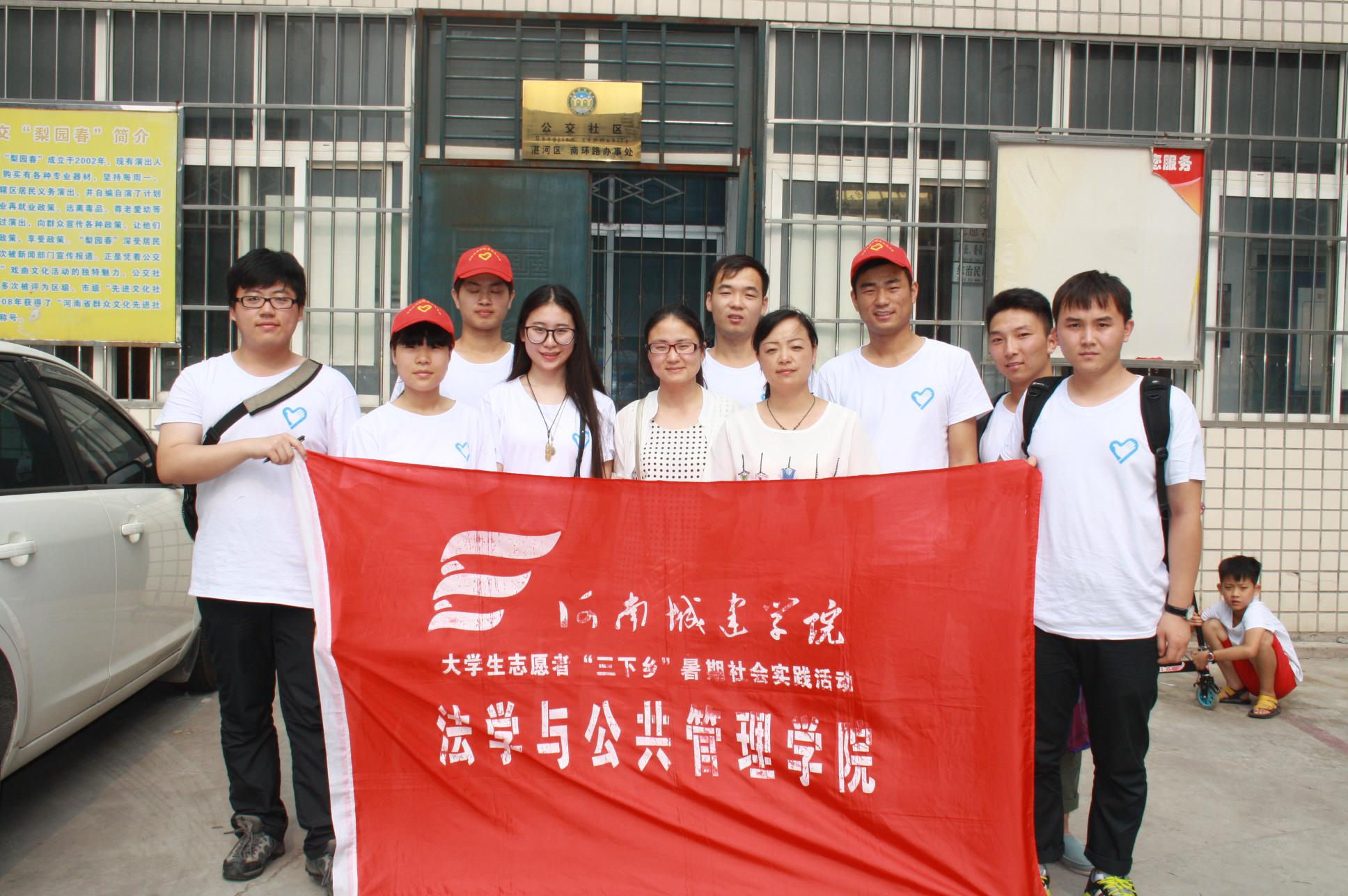 (通讯员:邓蕾 张之青云)2015年7月10日上午,法学与公共管理学院2015年暑期“三下乡”社会实践志愿服务队来到平顶山市湛河区南环路街道公交社区开展了社会政策与法律咨询活动。本次活动由湛河区区政协高主任、魏主任、指导老师赵超带队,法学院主席团全体成员以及数十名志愿者共同参加。