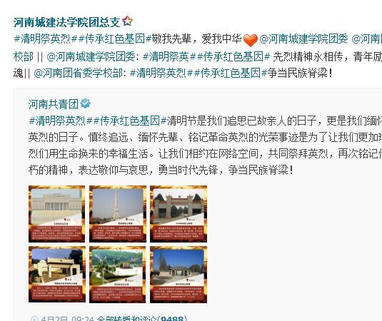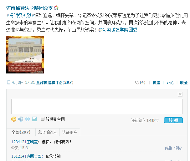(通讯员:邓蕾 张之青云)在清明节来临之际,为追寻英雄足迹,继承先烈遗志,弘扬民族精神,增强大学生的责任感和使命感,法学与公共管理学院团总支组织全体师生举行“清明祭英烈,共铸中华魂”为主题的网上公祭活动。该活动通过新媒体宣传,微信、新浪、腾讯微博同步启动,倡议大学生文明扫墓,共建美丽家园。