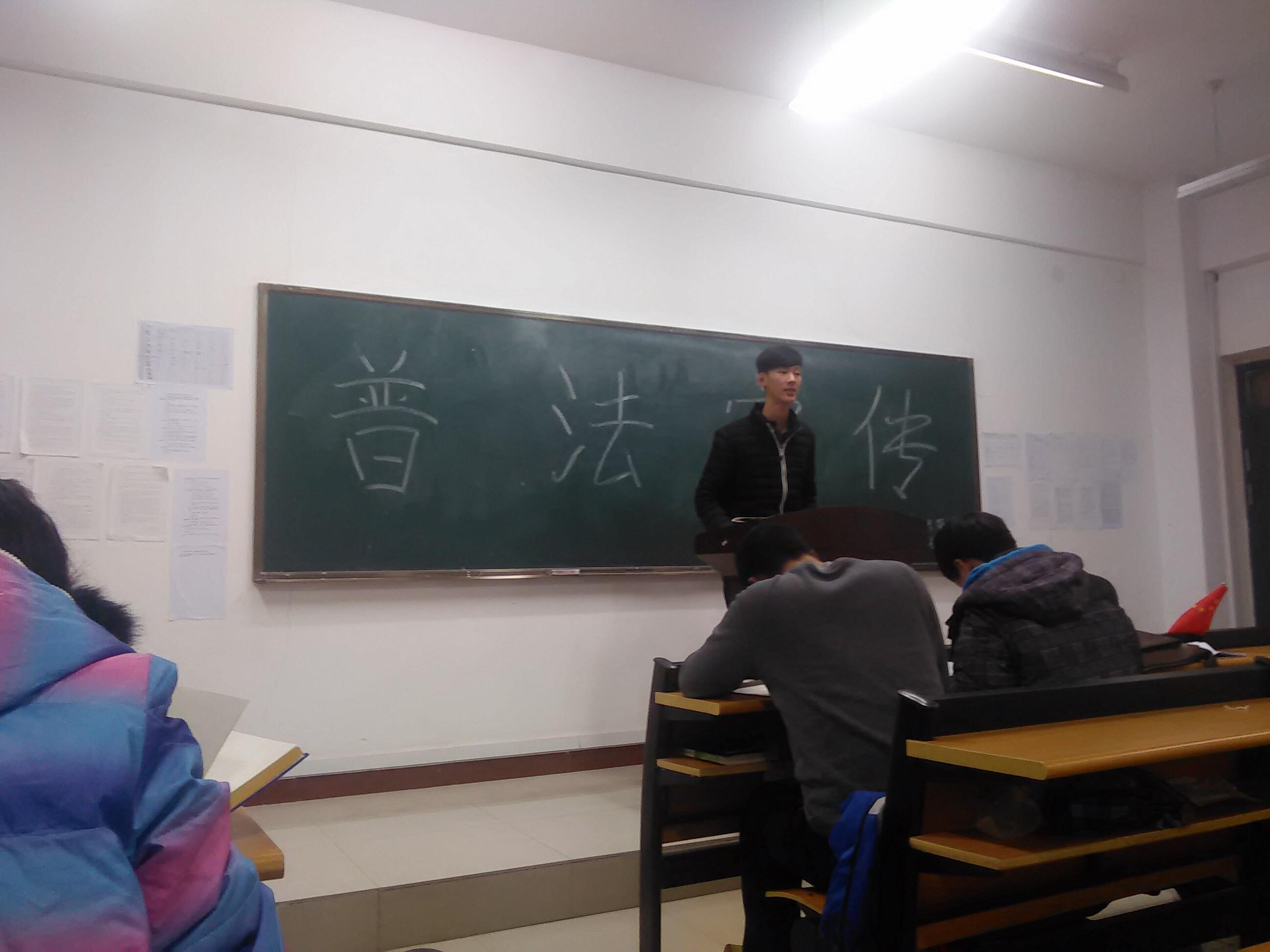 活动刚开始,副班长上台讲述道:为了祝贺法学与公共管理学院的普法宣传活动圆满取得成功,特开展这次主题团日活动。此次活动分为三个部分,首先由学生代表上台向同学们讲述一些必备的法律知识和常识,其中涉及《宪法》《知识产权法》《侵权责任法》等一系列书籍中的法律条例,让同学们在学习之余得到法律知识的普及。其次是由参加市区普法宣传的同学上台讲述他们普法宣传的经历。参与普法宣传的同学认为,在此次普法活动过程中,教师的认真指导,市民的细心聆听,大家的热情帮助,让此次普法宣传活动真正做到了服务大众,了解民情。最后,同学们发表了自己的感受和见解,大家都纷纷表示要做一个知法、懂法、守法的人。