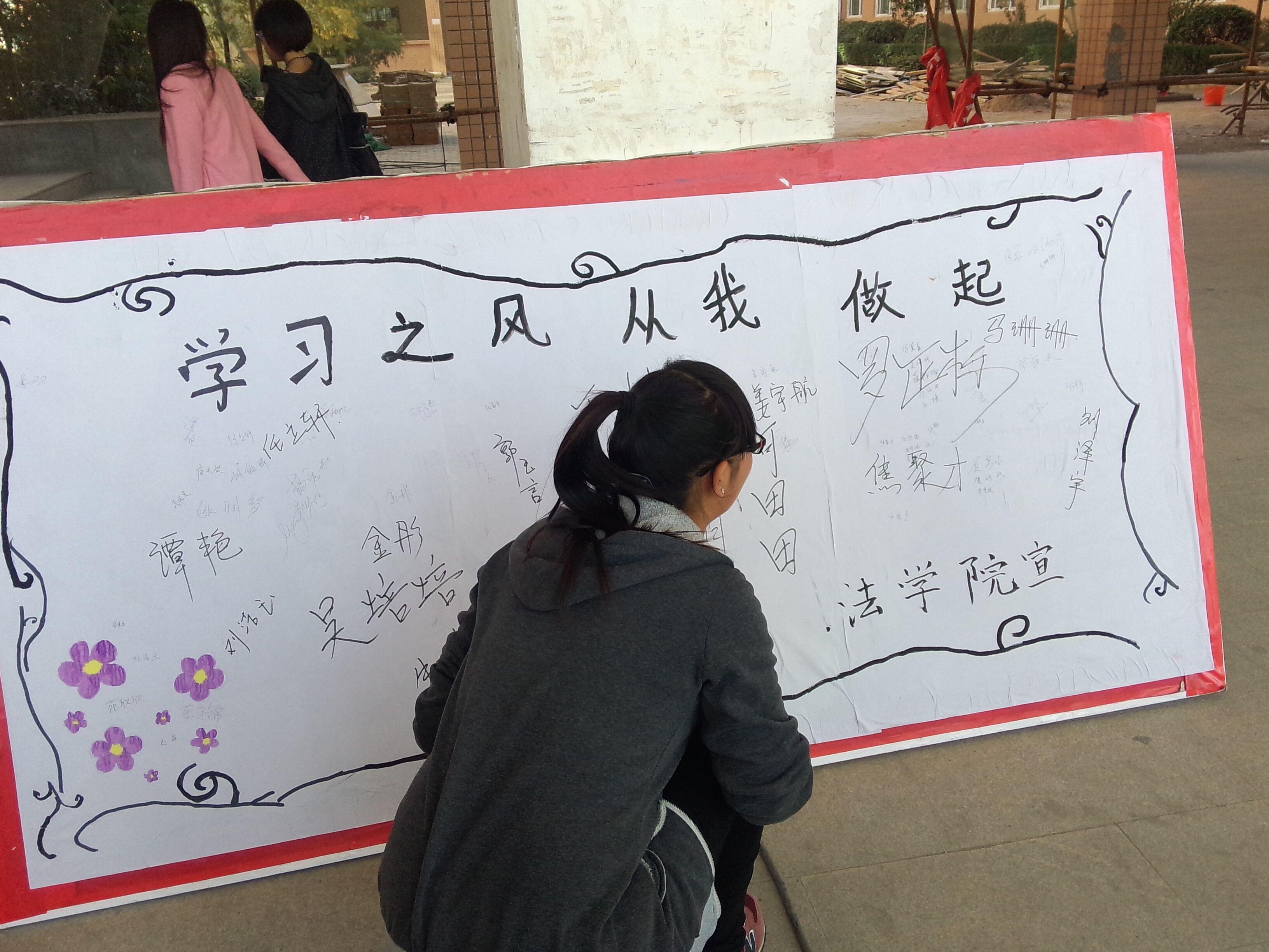 上午8点,法学院学生会在文学院四楼设立了文明监督岗,旨在提醒同学们勿带早饭进入教室,保持教室的干净整洁,创造一个良好的学习环境,督促大家形成良好的行为习惯。下午1点,法学院学生会举办了以“优化学风,从我做起“为主题的签名活动,该活动得到了同学们的热烈响应。这次活动以学生自主在版面上签名的形式来表示同学们爱文明的决心,使同学们加强珍惜时间、努力学习的意识,鼓励同学们奋发努力,建设良好的学风,时时刻刻都对学生产生强烈熏陶和感染。接着,大家参加了以“教风建设”为主题的座谈会,该座谈会由李老师主持,交流教育教学经验,宣扬优秀教师,并利用多媒体宣传先进教师的事迹,用先进典型的人格魅力和学识魅力激励、感染师生。最后师生间进行互动,加强沟通交流,教师听取学生对课程教学及专业发展情况的意见,不断改进教学方法,增强学生学习兴趣,提高教学质量。