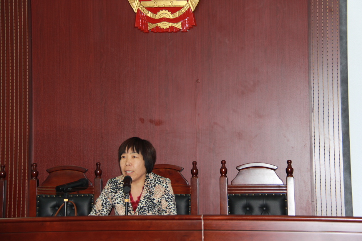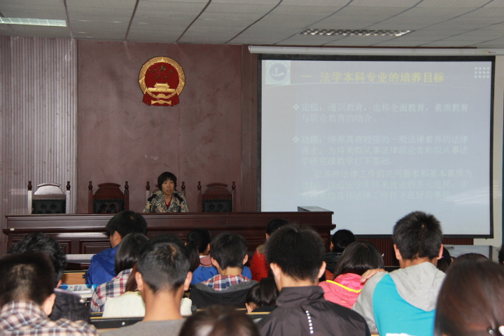 (通讯员 邓蕾 薛友超)按照校党委学生工作部的统一部署,法学与公共管理学院于11月6日下午在文管学区1号教学楼模拟法庭对2013级法学专业新生组织了“大学第一课”,本次课程由该院院长王艳芳教授主讲,党总支副书记李闯豪、办公室主任张强、学工办主任刘建华、团总支书记邓雷、全体辅导员及2013级法学专业全体新生出席了本次活动。