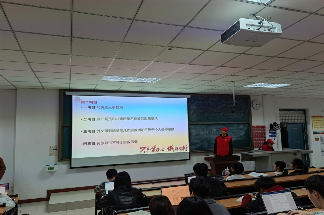 (通讯员 倪明 张俊辉)为进一步宣传宗教知识,弘扬健康科学的宗教观念,帮助同学们树立马克思主义宗教观,法学院青年志愿者协会于2021年11月1日在文管校区一号教学楼426教室面向法学院大一新生开展了一期宗教知识宣讲主题班会。