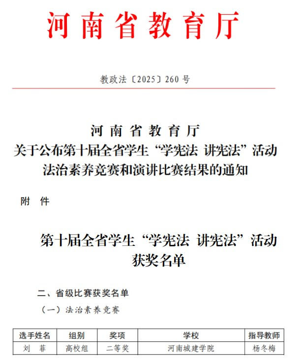 近日,河南省教育厅公布第十届全省学生"学宪法 讲宪法"活动比赛结果,我院2023级本科法学专业学生刘菲凭借扎实的法律功底和出色的综合素质,在该活动的法治素养竞赛中经过激烈角逐脱颖而出,荣获省级二等奖,为学校赢得了荣誉,我校也是本届法治素养竞赛中唯一获奖的平顶山地区高校。